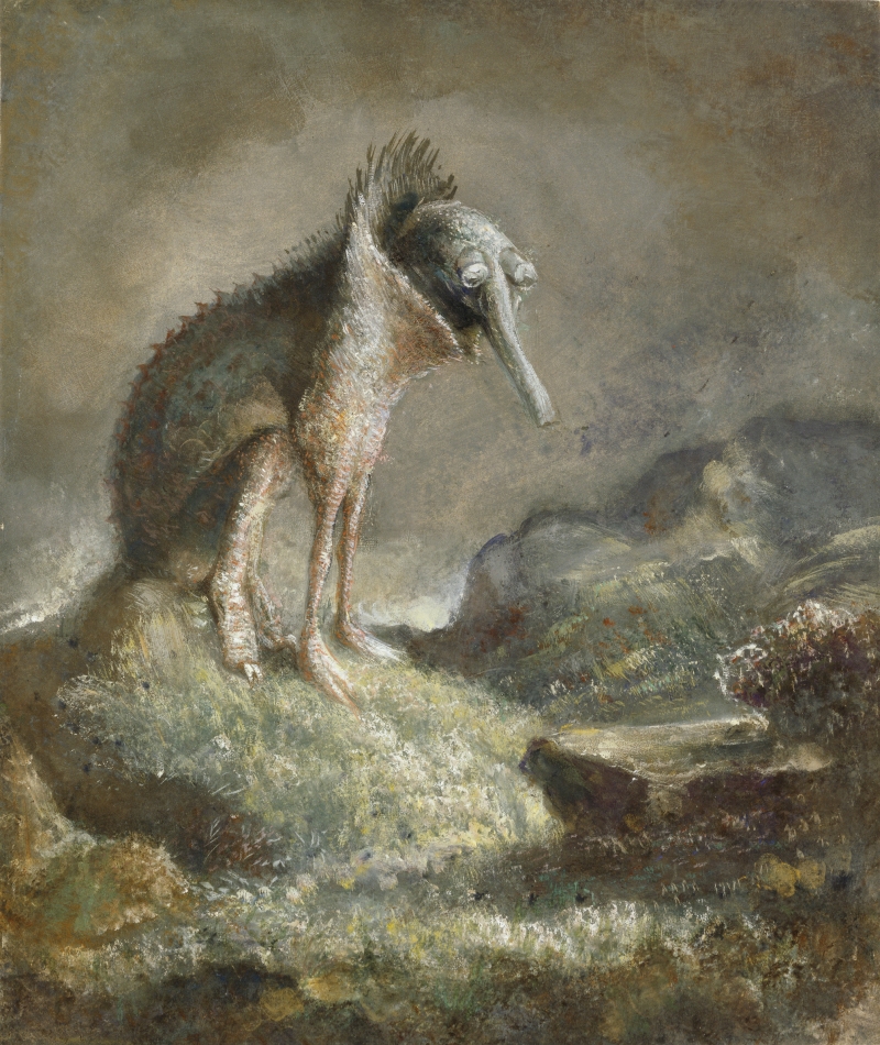 Das „Wesen vom Mars“ ist ein Außerirdischer, ein Alien. Alfred Kubin hat das Mischwesen aus verschiedenen Tierteilen zusammengesetzt: insektenartigen Kugelaugen, einer Rüsselnase, Vogelbeinen mit scharfen Krallen, einem gezackten Echsenrücken und dem gefleckten Leib einer Hyäne. Der grau-grünliche Kopf schaut aus einer schützenden Halskrause hervor, in die sich das Wesen wie eine Schildkröte in ihren Panzer zurückziehen kann. Das „Wesen vom Mars“ hockt einsam und verlassen auf einer kleinen Erhebung und überblickt eine karge Heidelandschaft unter einem grauen Himmel. Die Atmosphäre ist trostlos und man weiß nicht recht, ob sich das Wesen auf dem Mars oder auf der Erde befindet, ob man sich vor ihm fürchten oder ob man es bedauern soll. Kubin kann aus einem reichen inneren Fundus an Bildern schöpfen. Bereits als Kind sammelt er Käfer, hält Insekten, Reptilien und eine zahme Krähe. Er zeichnet Schlangen und Spinnen, liegt stundenlang am Ufer des Zeller Sees, um Fische, Molche, Schwimmkäfer und Ruderwanzen zu beobachten. Der Meister der schaurigen Phantasmen zeigt hier nicht nur seine immense Fantasie, sondern auch seine virtuose Meisterschaft als Maler und Zeichner. Das „Wesen vom Mars“ ist mit Pastellkreide und Gouache auf Pappe gezeichnet und gemalt. Besonders delikat ist die farbliche Behandlung des vorderen Körpers und der Beine mit Rosa-Weiß-Tönen, die der Künstler zu den im ganzen Blatt vorherrschenden Grau-Grün-Tönen kontrastiert. Als Kubin „Das Wesen vom Mars“ 1906 malt, ist er gerade mit seiner Frau ins oberösterreichische Wernstein in den alten Freisitz Zwickledt hoch über dem Inn gezogen. In dem Schlösschen schreibt er 1908 den fantastischen Roman „Die andere Seite“. Mitten im Ersten Weltkrieg, der in Kubin eine Schaffenskrise auslöst, fügt er auf der Rückseite des Blattes eine Widmung hinzu: „Marianne der besten Mutter, Gattin und Freundin weiht dieses im Jahre 1906 entstandene Bild, Alfred Kubin, Zwickledt im Mey 1917“. Marianne Grafe (1892-1951), geb. Weil war eine langjährige Freundin Kubins und die Ehefrau des mit dem Künstler befreundeten Lyrikers und Kubin-Sammlers Felix Grafe (1888-1942). Ihr hatte Kubin „Das Wesen vom Mars“ im Mai 1917 gewidmet und geschenkt.