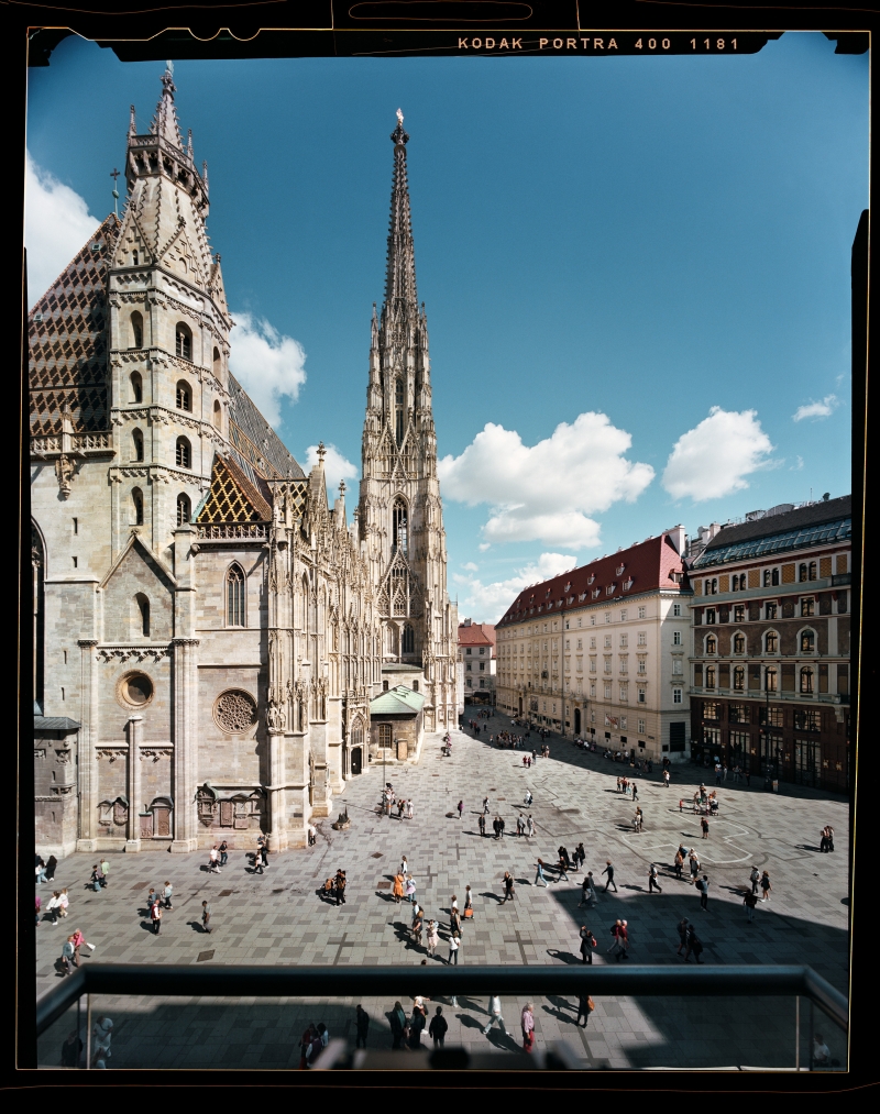 So gibt die Ausstellung die einmalige Möglichkeit das „Damals“ mit dem „Heute“ zu vergleichen und zugleich das Werk der drei Künstler unter einem ganz spezifischen Gesichtspunkt kennenzulernen. Dabei führt diese Reise von der Spinnerin am Kreuz über das Zentrum von Wien mit dem Stephansdom und der Karlskirche bis Schloss Schönbrunn und abschließend in das Gasteiner Tal: Stefan Oláhs Blick entgeht nichts. Er ist ist nicht wertend, vielmehr analytisch. Oláh zeigt Orte, die über 200 Jahre kaum Veränderungen erfahren haben, andere hingegen, die heute buchstäblich „verbaut“ sind.