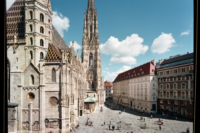 So gibt die Ausstellung die einmalige Möglichkeit das „Damals“ mit dem „Heute“ zu vergleichen und zugleich das Werk der drei Künstler unter einem ganz spezifischen Gesichtspunkt kennenzulernen. Dabei führt diese Reise von der Spinnerin am Kreuz über das Zentrum von Wien mit dem Stephansdom und der Karlskirche bis Schloss Schönbrunn und abschließend in das Gasteiner Tal: Stefan Oláhs Blick entgeht nichts. Er ist ist nicht wertend, vielmehr analytisch. Oláh zeigt Orte, die über 200 Jahre kaum Veränderungen erfahren haben, andere hingegen, die heute buchstäblich „verbaut“ sind.