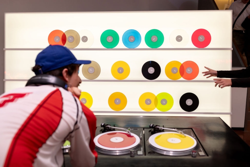 As a special feature of the exhibition, visitors are encouraged to interact with the works in a participatory way. One example of this is Carsten Nicolai's work Bausatz noto, in which the visitors themselves act as sound artists: At a table with four record players, different colored vinyls with different timbres can be combined. Carsten Nicolai will create a light and sound installation exclusively for the exhibition.